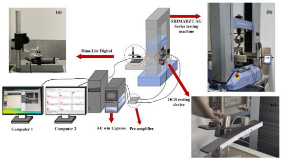 DCB testing device and AE data acquisition device (a) Dino-lite digital, (b) SHIMADZU AG Series universal electronic testing machine, (c) Laminate specimens and sensors.