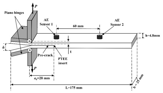 where h is the thickness of the laminate, and hp is the thickness of the loaded hinge. The equivalent crack length theoretical (Equation (2)) and the modified parameter F (Equation (3)) are substituted into Equation (1). According to Euler–Bernoulli beam theory, for a cantilever DCB specimen, the strain energy release rate is calculated as follows: