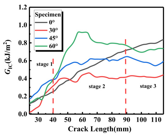 According to Equation (5), the strain energy release rates of laminates with different interface fiber orientations, in the process of crack initiation and propagation, are obtained, as shown in Table 2 and Table 3. The energy release rate curve can be divided into three stages, as shown in Figure 5. With the crack initiation and propagation of laminates, the strain energy release rates of laminates with different interface fiber orientations show an upward trend and resistance fracture behavior. In the first stage, the slope of the overall ascending trend is larger, and the load of the sample with unidirectional (UD = 0°) laminate is the largest, while the energy release rate is the lowest. When the crack propagates to the second stage, except for the UD laminate, the energy release rate of the other three paved specimens decreases slowly when the crack length reaches 50~60 mm. The energy release rates of the four interface fiber orientations are 0.4767, 0.3758, 0.5764, and 0.9308 kJ/m2, respectively, as shown in Table 3. In the third stage, except for the UD laminate, the energy release rates of the other three laying angle specimens showed a downward trend, and increased slowly after the crack extended to 110 mm. At this time, the energy release rates of the four interface fiber orientation specimens were 0.7852, 0.4276, 0.5795, and 0.6984 kJ/m2, respectively. The effective delamination extension to correct for the rotation of DCB arms at the delamination front caused by crack propagation was 0.021095, 0.0041697, 0.007669, and 0.00461664 mm, respectively. When the samples with four interface fiber orientation reached the maximum load (111.34 ± 0.14, 66.28 ± 0.12, 80.87 ± 0.32, 112.21 ± 0.07 N), the energy release rate fluctuated to different degrees, the load curve showed a downward trend, and the highest displacement was 6.29 ± 0.13, 3.78 ± 0.01, 3.72 ± 0.29, and 0.98 ± 0.15 mm, respectively. MBT method considers a linear elastic behavior and assumes that the nonlinear effects are confined to a small-scale fracture process zone (FPZ) ahead of the crack tip. When extensive nonlinearity occurs, the small scale FPZ assumption breaks down, and the LEFM based results can be biased [32].