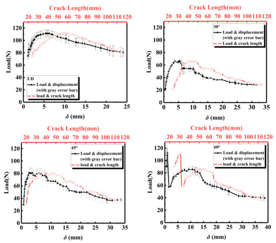 Figure 6 shows the load as a function of displacement and delamination length for laminates with different interface fiber orientations. The standard error of triplicate experiments is also indicated by the gray error bar in the figure. It can be seen that, at similar displacements, the unidirectional laminate has the highest load, which means that the crack in the unidirectional (UD = 0°) specimen requires a larger load to propagate. Due to the existence of prefabricated cracks, the tensile load-opening displacement of the laminates, with different interface fiber orientations, showed a linear relationship in the load rising stage. The load of the 60° interface fiber orientation showed a rapid increase, and then a sudden decrease, in the opening displacement and the initial stage of cracking, which was mainly caused by the bonding between the loading piano hinge and the laminate. When the crack length reaches the delamination front of the prefabricated crack, the load and opening displacement of the laminates with different interface fiber orientations show nonlinear characteristics. When the maximum load is reached, the destabilization expansion of delamination damage causes the load of the fiber-oriented laminates at different interfaces to show a downward trend. Except for the UD specimen, the other three interface fiber-oriented laminates show anti-fragmentation bending effects. Due to the uneven layered growth of cracks along the specimen, the load curve exhibits multiple fluctuations of rising and falling.