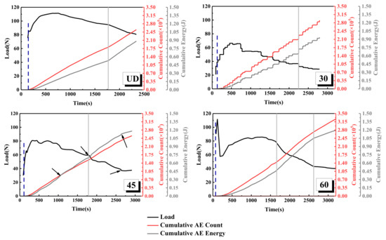 It can be seen from Figure 7 that the strain energy release rate of the 30° laminate is the lowest, and the highest point can bear the load of 66.28 ± 0.12 N. The fiber of the 30° laminate is angled, so the stress of crack propagation fiber is uneven under tension. The decrease in interlaminar shear strength leads to the fracture of a large number of interlaminar fibers after the bridging phenomenon, and the crack propagates suddenly. The cumulative AE energy and cumulative counting curves of the 45° laminate have three inflection points in Figure 7—with the sudden drop in load at about 1000 s, the cumulative AE energy suddenly increases, and the load decreases from 79 to 65 N; then, at the second inflection point of 1700 s, the load decreases from 60 to about 50 N, and the cumulative AE energy increases again; until about 2700 s, when the load has an upward trend again, and the cumulative AE energy has a slow downward trend. This also shows that the tensile stress of the 45° laminate reaches the highest point at the third inflection point, which is the early stage of instability. The cumulative AE energy and cumulative counting curves of the 60° laminate also have two inflection points at about 1600 and 2600 s. Combined with the changing trend of the energy release rate curve of Figure 5, the energy release rate of the 60° laminate at the two inflection points has a downward trend, and the load also shows a downward trend; on the contrary, the cumulative AE energy has a sudden upward trend.
