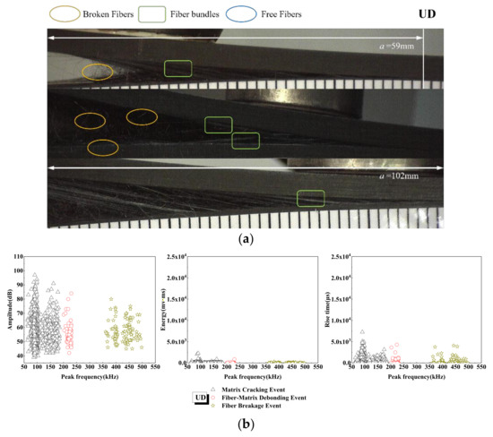 Different frequency ranges of acoustic emission signals are related to different failure modes of composites [54,55,56]. It can be seen from Figure 8 that the damage mechanism of the UD laminate, based on frequency distribution, is mostly concentrated in the matrix cracking event, and the amplitude is in the AE signal of 35~100 dB. With the increase in tensile load, the debonding signal of the fiber matrix is higher than that of cracking, and then a large number of signals appear in the stage of fiber fracturing. In addition, the occurrence time of interfacial debonding is later than that of cracking, mainly because the damage evolution processes of the two failure mechanisms are different. As the support, the matrix first contacts and bears the tensile load, so the crack at the interface between the resin and the fiber bundle propagates under the action of stress concentration, so the fiber bundle gradually bears the main load with the increase in sample load and tensile deformation. In the process of delamination instability propagation, the crack propagation leads to the interface debonding between the fiber in the crack initiation zone and the matrix. It can be seen from the microscopic interface of Figure 8 that the crack in the UD laminate always propagates slowly along the pre-crack layer, and the damage mechanism is mainly concentrated in the stage of matrix cracking and fiber fracture. In addition, through the variation of AE energy and rise time with peak frequency in Figure 8, it can be seen that in the three damage events, the amplitude and rise time of debonding and fiber fracture are lower than that of matrix cracking. The overall damage of UD laminate is small, and the energy is low, which further shows that the signal generation phenomenon is consistent with the cumulative AE energy and the cumulative counting damage evolution, and the crack propagation is uniform and slow, and the damage accumulation is mainly concentrated in the delamination tip area.