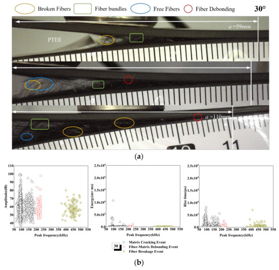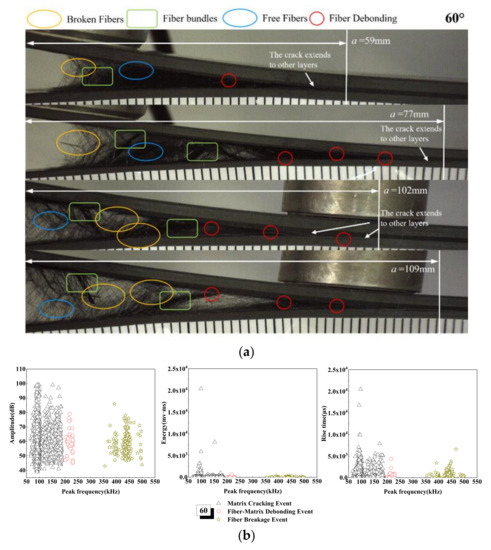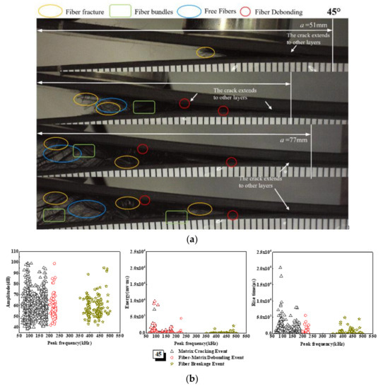 The amplitude, energy, and rise time of AE of the 45° laminate change with the peak frequency—that is, the three damage mechanisms are significantly higher than those of the UD and 30° laminates, as shown in Figure 10. From the microscopic interface, it can be seen that there are many damage mechanisms in the failure forms of the 45° laminate, such as matrix cracking, bundle cracking, interfacial debonding, interfacial slip, fiber fracture, fiber bundle fracture and fiber pull-out. Therefore, in the form of instability and failure, acoustic emission produces a large number of signals with a wide range of distribution. From the variation diagram of energy with peak frequency, it can be seen that there is a phenomenon of signal superposition in the range of 50~250 kHz, and there is a partial overlap between matrix cracking and fiber matrix debonding signals. This is mainly due to the superposition of damage modes when the specimen fails; the complex AE signal superposition phenomenon will focus on instability failure and multiple damage mechanisms [57]. The transverse crack propagation generally occurs relatively straight along the position of the pre-crack under high tensile stress. As can be seen from the microscopic interface in Figure 10, with the delamination crack of the specimen, the crack in the bundle crack area will be closer. Additionally, with the gradual increase in the load, the angular fiber leads to the slip of the crack tip, resulting in serious interfacial debonding of the fiber matrix (such as a = 77 mm in Figure 10). As a result of interface slip and fiber bundle fracture, the fibers are easily pulled out, and a large number of fibers are pulled out at the edge of the sample.