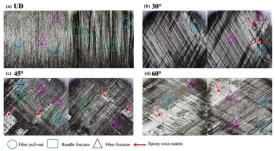 In addition, through the delamination failure interface of four interface fiber orientations (Figure 12), it can be found that the damage mechanism of the UD laminate is concentrated in fiber pulling out, fiber fracture, fiber bundle fracture, and so on. As for the 30° laminate, due to the laying angle, as can be seen in Figure 12b, after the fiber is pulled out and broken, part of the epoxy resin matrix leaks out. The transverse interface damage of the 45° laminate is more serious and complex, the fiber is pulled out and broken in the shape of the wire bundle, the bulk resin matrix is exposed, there are holes in the pull-out place of the fiber, and a large number of broken fibers appear in the left and right edges and weak areas in the middle of the specimen. The fiber bridging phenomenon of 60° laminate is serious, so a large area of epoxy resin matrix can be seen on the damaged cross section; the laid fiber is pulled out and broken in the shape of wire bundle, and there are a large number of broken fibers left on the failure interface of the specimen.