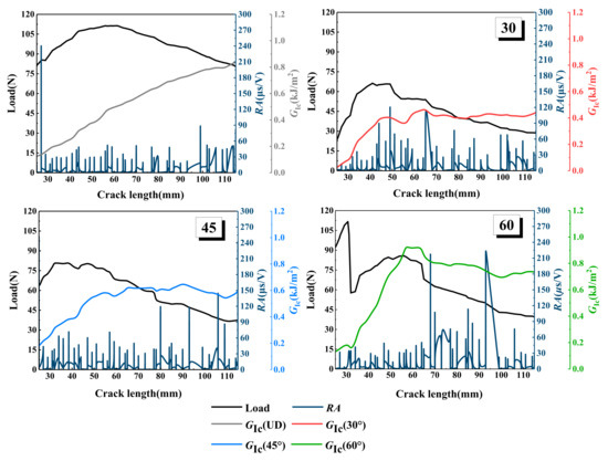 The comparative analysis of the above acoustic emission analysis results and energy release rate shows that the most directional trend is that the RA value will increase with the increase in load. The variation curves of RA value, energy release rate, and load, with crack length of the different interface fiber orientations, are shown in Figure 13. It can be seen from the figure that the strain energy release rate of the UD laminate is low at the initial stage of loading, and the RA value is as high as 240 μs/V at 79 N. Then, the RA value is always lower than 60 μs/V until the crack extends to 100 mm, when the RA value suddenly increases to 90 μs/V. According to the definition of RA value, a higher RA value indicates that the laminate has transverse cracking during delamination failure, which confirms the damage mechanism of the UD laminate in Figure 7. The crack initiation of type I damage is initially caused by triggering delamination, and then, the crack propagates slowly; the damage is mainly concentrated in the crack tip area, and the transverse cracking gradually reaches saturation until the specimen fails. The fluctuation of the RA value of the 30° laminate is consistent with the increase in energy release rate and load fluctuation; when the cracking length is 40~50 mm, the RA value increases to 90 and 120 μs/V, and the energy release rate increases to 0.4 kJ/m2. When the delamination crack increases to 50 mm, the load on the specimen is 66.28 ± 0.12 N, which is the maximum load of 30° laminate, and the maximum RA value is produced in the loading step, which indicates that the transverse crack is close to or reaches saturation. Fiber debonding occurs here, which verifies the results of microscopic visualization and AE signal analysis in Figure 9. The RA value step of the 45° laminate is different from that of the UD and 30° laminates, which mainly occurs during the delamination length from approximately 80 to 110 mm. The energy release rate of the 45° laminate increases gently, and the RA value increases obviously at the position of the energy release rate fluctuation and loading step. With the decrease in the load, the RA value increases significantly, which is mainly due to the fiber bridging phenomenon of the 45° laminate with the crack, which leads to the interlaminar damage being concentrated in the pulling out and debonding of the fiber bundles in the later stage of loading, leading to serious shear cracking, so a higher RA value occurs during failure, which is consistent with the results found in Figure 10. The RA value of the 60° laminate is the highest among the four kinds of laminates with different interface fiber orientations; it can be seen from Figure 13 that, when the delamination length is 70 mm, the strain energy release rate decreases steeply, the load decreases from 80 to 65 N, and the RA value increases to 210 μs/V. Consistent with the conclusion in Figure 11, the interface slip occurs at the crack tip because there are a large number of fibers to be pulled out in bundles, and sudden debonding after delamination propagation is delayed, resulting in a large amount of AE energy and a large RA value.