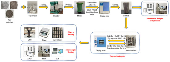 The changes in appearance, UCS and mass of the specimens were observed after different cycles, and statistical comparisons were recorded. The mass change considered was the mass loss rate ΔmTi (%), which was calculated with Equation (1): the difference between the mass m0i of the ith specimen in the initial state and the mass mTi after the Tth cycle was recorded as the mass loss of the ith specimen. The ratio of the mass loss (ΔmTi) to the initial mass (m0i) was the mass loss rate. When the cumulative mass loss due to dry–wet cycles was <2%, it was taken to reflect the resistance of the SWCPB to dry–wet cycles [25].