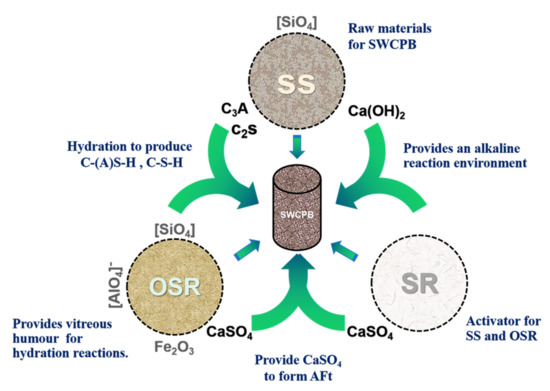The presence of calcium hydroxide (Ca(OH)2) in the SS raw material, together with the SR, created an alkaline environment for the hydration reaction. This effectively stimulated the activities of SS and OSR. During this process, the OSR provided large amounts of Al2O3 and SiO2 for the internal hydration of the SWCPB and promoted the formation of C–S–H/C–A–S–H gels in the material. In addition, CaSO4 in SR and OSR was involved in the hydration reaction and produced AFt. The chemical reactions, Equations (2) and (3), for hydration occurred as follows. The interlocked combination of C–S–H gel and AFt created the cementing strength of the material. The hydration of C2S, C3S, and C3A in SS also increased the compressive strength of the material. Therefore, through complementary synergy between the raw materials, a hydration reaction similar to that of cement resulted.