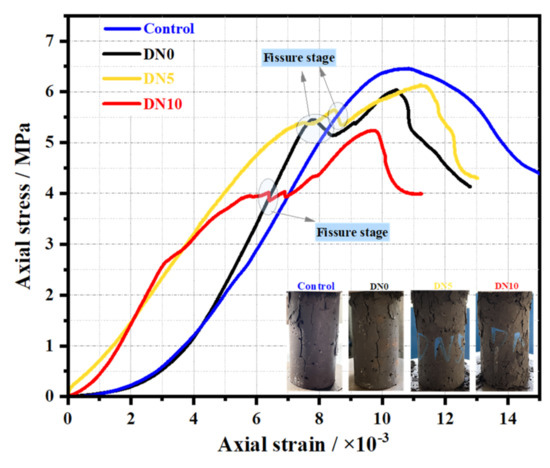 Figure 9 shows that specimens subjected to erosion exhibited lower peak stresses in the UCS tests after dry–wet cycling under different conditions compared to uneroded specimens. The peak strength stresses were relatively low for specimens subjected to erosion with 10% Na2SO4. The internal pores of specimens eroded with Na2SO4 may have been filled due to the formation of erosion products, which would have resulted in premature stress damage. In addition, in the stress–strain curve shown in Figure 9, the phenomenon of fluctuations before the peak stress was the “Fissure stage”. It can be seen that the specimens eroded by the high sulphate concentrations cracked first. This indicates a release of strain energy, followed by compaction of the specimen, and finally the peak stress, at which point the specimen was damaged. This result was similar to those obtained in a study of fly ash cementitious materials by Cui et al [20]. It is worth noting that the specimens under different erosion conditions exhibited different fluctuations at the “Fissure stage”, with the fluctuations decreased in the order of DN0 > DN5 > DN10. This phenomenon of delayed damage occurred during the plastic deformation phase of the stress–strain curve. At this point, the appearance of microcracks in the specimen and the increase in the number of cracks with increasing stress indicated that damage to the specimen had begun [20]. It can be seen that higher concentrations of sulphate accelerate the erosion of the specimen and reduce the strength of the SWCPB, thus reducing the ability of the specimen to resist stress damage. Observations of the damaged specimens showed that the depth of erosion increased with increasing sulphate concentration. During the tests, damage debris continued to accumulate around the core of the specimen and residual stresses existed in all specimens after the peak stress.