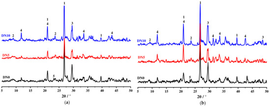 According to Figure 10a, the AFt diffraction peak in the XRD for specimen DN0 eroded in water was weak and there was no obvious diffraction peak for gypsum, but the diffraction peak for Ca(OH)2 was present. Diffraction peaks for AFt were present in the XRD for DN5 and DN10 and gradually increased with increasing Na2SO4 concentration, and the diffraction peak for gypsum was present in the XRD for DN10. This indicates that Ca(OH)2 was largely consumed after the eighth cycle, and this contributed to gradual increases in the production of AFt and gypsum as the concentration of the eroding solution was increased. A comparison of Figure 10a,b shows that the XRD peak shape was sharper after 12 erosion cycles than after 8 cycles. This indicates that crystallisation of the erosion products gradually stabilised and more crystallised material formed as the cycling period was increased.