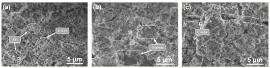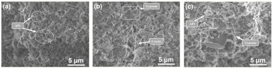 When the Na2SO4 concentration was high, the formation of AFt was accompanied by the precipitation of gypsum. On the one hand, the solid volume increased by 124% when gypsum was formed, which caused the SWCPB to crack [21,31]. On the other hand, the production of gypsum consumed Ca(OH)2 and reduced the alkalinity within the specimen; this resulted in the decomposition of hydration products such as C–S–H, which led to a loss of strength and a reduction in the durability of the SWCPB. The production of gypsum is demonstrated in Equations (9) and (10):