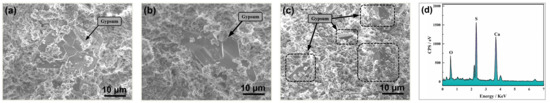 Different distribution patterns and EDS energy spectra of gypsum: (a–c) distribution patterns; (d) EDS energy spectrum of gypsum.