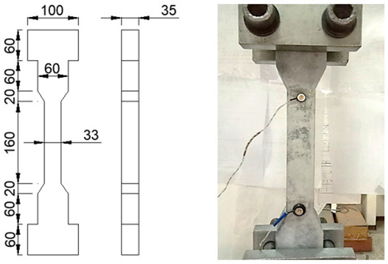 The compressive strength of the UHPC materials was obtained by tests on 100 mm by 200 mm cylinder specimens. The specimens were prepared in accordance with ASTM C172, fabricated and cured in accordance with ASTM C31, and tested in accordance with ASTM C39. The uniaxial tensile strength of UHPC was obtained by direct tension tests on UHPC dog-bone-shaped specimens. The geometry and test setup of the tensile specimens are shown in Figure 1. The material tests were conducted using a displacement-controlled procedure with a loading rate of 0.01 mm/min for the uniaxial tensile test and load controlled procedure with a loading rate of 0.25 MPa/s for the compression test.