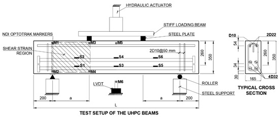 The tests were conducted using a hydraulic actuator with a capacity of 5000 kN at a constant loading rate of 1.5 mm/min. The tests were terminated when the beam’s strength dropped to 70% of the peak load. During the tests, the mid-span deflection of the beams was recorded using an optical measurement system, i.e., NDI OptoTRAK Certus. The NDI Optotrak Certus system consisted of a camera, OptoTRAK Certus, and multiple position sensors (infrared light-emitting diodes). The change in the measured distance between the sensors located at the mid-span of the beam (M5) and beneath the mid-span of the beam (M6) was employed as the deflection of the beam. Additionally, a linear variable displacement transducer (LVDT) was used to validate the displacement data collected by the NDI OptoTRAK Certus system (see Figure 2). To monitor the strain of tensile reinforcement, six strain gauges (S1-S6) were installed, as shown in Figure 2. The average shear strain, γ, in the shear critical region of the beams was monitored using the NDI sensors deployed at the four corners, as shown in Figure 2. The average shear strain was estimated using the equation proposed by [58] based on the quadrilateral element formed in the shear strain region shown in Figure 2.