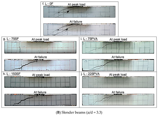 Similar to the MHS fibers, the inclusion of PVA fibers in the slender UHPC beams was effective in terms of controlling the crack width, promoting the development of narrower cracks. At the peak load, the inclined cracks in L - 75PVA were wider than that in L - 75SF. This was likely because the PVA fibers had a shorter effective length than the MHS fibers; thus, they were less effective in controlling the crack width when the shear transfer mechanism was dominated by diagonal tension. However, it is interesting to note that at the post-peak stage, the cracks in S - 75PVA became narrower than that in beam S - 75SF. The wider localized crack in the UHPC beams with MHS fibers could be attributed to the greater tensile strain-hardening behavior, which limits the growth of the narrow cracks beyond the localized crack.