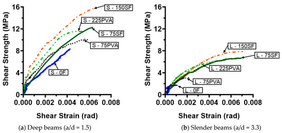 As for the peak shear strain, it was only moderately improved with the inclusion of fibers (by less than 60%) for the deep UHPC beams, regardless of the type of fibers. In contrast, for the slender beams in which the shear transfer mechanism was governed by beam action, the inclusion of fibers became significantly more effective in improving the peak shear strain. The uses of the MHS fibers at Vf = 0.75% and 1.50% similarly enhanced the peak shear strain of the slender UHPC beam by 6 times. Compared to MHS fibers, the enhancement in the peak shear strain was reduced when PVA fibers were used. The peak shear strains of the slender UHPC beams with Vf = 0.75% and 2.25% of PVA fibers were 2 and 3 times higher than that of their control beam, respectively. These results demonstrate that when PVA fibers were used in slender UHPC beams, the efficiency of the amount of fibers was higher with Vf = 2.25% than with Vf = 0.75% for simultaneously improving the peak shear strength and strain of slender UHPC beams.