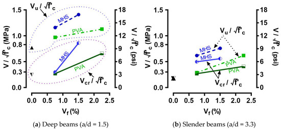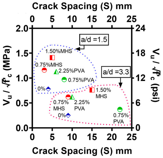 Moreover, it is interesting to note that while a greater amount of fibers enhanced the peak shear strength regardless of the type of the fibers, the uses of PVA fibers and MHS fibers had distinctly different effects on the average crack spacing. For both deep and slender UHPC beams with Vf = 0.75%, while the inclusion of MHS fibers had a minor effect, the use of PVA fibers increased the average crack spacing by about two times compared to the control specimen. When Vf was further increased from 0.75%, the average crack spacing was increased in the case of MHS fibers, whereas it was reduced in the case of PVA fibers.
