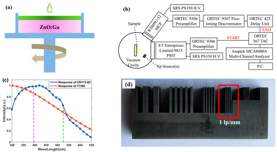 The RL spectra of GZO and composite samples were measured. An X-ray generator (12 W X-ray source, Moxtek, Orem, UT, USA), a photomultiplier tube (PMT, 77360, Newport, Irvine, CA, USA), a spectrometer (74126, Newport, Irvine, CA, USA), and a power meter (1936-R, Newport, Irvine, CA, USA) were used. The spectrometer was connected to a PMT. The spectral response of the PMT is shown in Figure 1a.