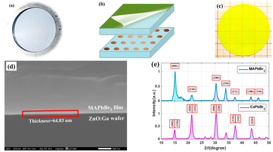 GZO single crystals were fabricated by the State Key Laboratory of Optoelectronic Materials and Technologies, School of Materials, Sun Yat-sen University. A hydrothermal method was used to grow a high-quality gallium-doped ZnO bulk single crystal [34]. Two-layer composite scintillators were successfully produced through high-temperature mixing, suspension coating, and negative pressure drying, as shown in Figure 1a. For more details, CsPbBr3 and MAPbBr3 film were fabricated by modified precipitation methods [35,36], respectively.
