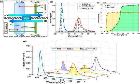 The working principle of the composite samples is shown in Figure 3a. X-rays simultaneously act on GZO and the perovskite film. Both are body sources for luminescence. As the light path shows in the 01# area, the output light contains three components on the perovskite side: (a) the light produced by the perovskite film, (b) the light produced by GZO and transformed by the perovskite film, and (c) the light produced by GZO but that failed to be transformed by the perovskite film. As shown in the 02# area, the output light also contains three components on the GZO side: (a) the light produced by the perovskite film and transported through GZO, (b) the light produced by GZO and emitted forward, and (c) the light produced by GZO but emitted backwards to the perovskite film, then transformed by the perovskite film, and finally emitted forward.