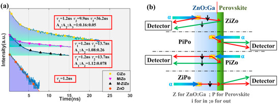 The decay times of the composite samples are shown in Figure 4a. A single photon acquisition system was set on the GZO side since the perovskite film absorbed almost all the GZO RL. Different from X-ray excitation conditions, the RL sample excited by alpha particles was a point source and could statistically be treated as one area source near the surface. Correspondingly, the decay of each kind of luminescence in GZO, especially its own luminescence, should be considered. As shown in Figure 4b, the test should be divided into four cases according to the directions from which alpha particles arrive and in which photons are collected.