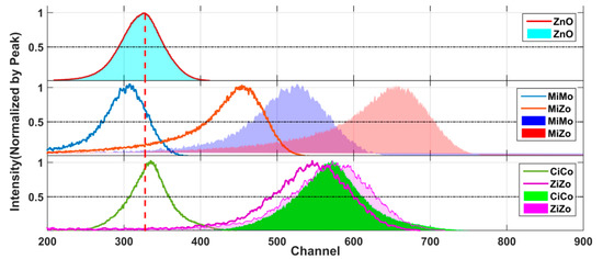 Compared with those of the peak channel of GZO, the output luminescence intensities of the composite samples were all notably increased. In the PiPo cases, the ratio of output luminescence intensity to that of GZO was 174% for the CsPbBr3-coated samples and 160% for the MAPbBr3-coated samples. The ratio was 201% for the MAPbBr3-coated samples in the PiZo cases and 175% for the CsPbBr3-coated samples in the ZiZo cases.