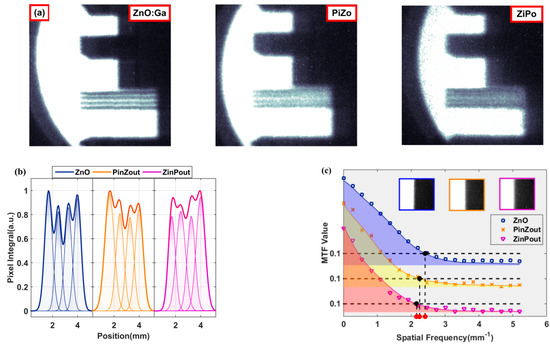 As an application, a series of imaging tests were performed on the samples, as shown in Figure 6. The image resolution decreased after coating but was still over 1 lp/mm. The uniformity of the luminance was 92.5%, and the half-width of the pixel position was 0.65 mm for the GZO wafer. When GZO was the image surface of the composite samples, the uniformity of the luminance and the half-width of the pixel position were 90.7% and 0.77 mm, respectively. When the perovskite film was the image surface, they were 90.3% and 0.77 mm, respectively. Values of the above structures were 2.41, 2.25, and 2.16, respectively. With the perovskite film, the imaging quality of the samples decreased slightly, but the response to X-rays was strengthened.