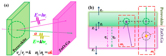 To describe the whole process, light transmission was refined into two parts: at interfaces and inside materials. The assumption was made that transmission of light of all wavelengths was equal for one interface, but differences in the GZO absorbability of luminescence at different wavelengths were still retained. As shown in Figure 6b, for half-space uniformly distributed light, the ratios of luminescence passing through the GZO–air, perovskite–air, GZO–perovskite, and perovskite–GZO interfaces were set as , , , and , respectively. The decay ratios of light passing through the GZO wafers were set as for perovskite luminescence and for GZO luminescence. For convenience, and were set.