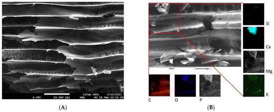 SEM (A) and EDX (B) images of CC biochar. EDX elemental distribution maps show elemental (C, O, P, Si, Ca, Mg, and K) composition of area closed by red lines in panel (B).