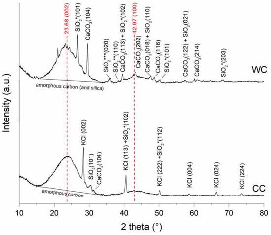 XRD analysis was applied to determine the level of pyrolysis and identify the crystalline structure of biochars. The X-ray diffraction patterns are shown in Figure 3, and it is clear that both CC and WC biochar exhibited broad peaks at 2θ 23.68° (002) due to scattering of X-rays by amorphous carbon (and amorphous silica) [40], and 42.97° (100), indicating the presence of aromatic carbon and formation of turbostratic crystallites [41]. Generally, sharper C (002) and C (100) peaks indicate a higher degree of crystalline orientation of C in biochar samples [42]. Biochar produced from wood chips at 500 °C consisted of several other crystallite phases such as calcite (CaCO3) and quartz (SiO2). In contrast, corn-cob biochar was more strongly associated with the presence of sylvite (KCl) and quartz (SiO2), and only very slightly with calcite (CaCO3), and other mineral impurities. The higher carbonate content of WC biochar is probably related to the presence of calcium oxalate (CaOx) crystals in the leaves, wood, and bark of many plants, which transform to calcite at pyrolysis temperatures above 500 °C [43]. Moreover, the formation of calcite contributes to the alkalinity of the prepared CC and WC biochars, as shown by their relatively higher pH values (Table 2).