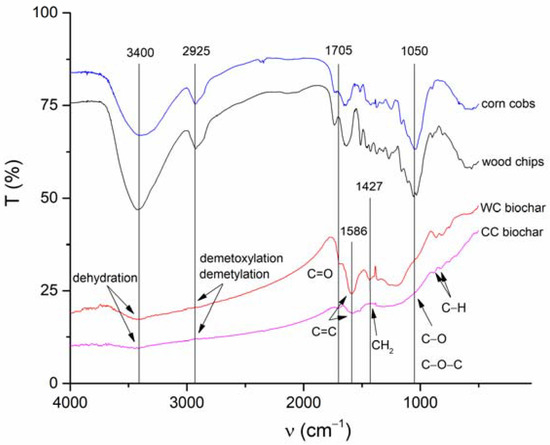 Surface functional moieties of BC and CC biochars and corresponding feedstock measured by FT-IR in the mid-infrared region are shown in Figure 4. It is clear that the FT-IR spectra of both biochars pyrolyzed at 500 °C compared to the feedstock material showed a substantial decrease in (i) O-H groups’ vibrations (3400 cm−1) as a result of dehydration, and (ii) aliphatic C-H stretch vibrations (2925 cm−1) because of lignin demethoxylation and demethylation during pyrolysis [20]. However, the aromatic ν(C=C) band at 1586 cm−1 and C-H bending aromatic CH out-of-plane deformation at 876, and 820 cm−1 have significant intensities in both studied biochars (Figure 4). The biochars’ low-intensity bands at 1050 and 1705 cm−1 are associated with carbonyl and carboxylic groups C-O and C=O stretching vibrations of undecomposed cellulosic and ligneous carbon [44]. The spectral properties of biochar are often related to the mineral fraction of BC. The abundance of carbonate (CO32−) is suggested by peaks at 820 cm−1 and is in agreement with the presence of calcite in both the CC and WC biochars (Figure 3). In addition, the spectral region of 1140–1000 cm−1 matches the Si-O and Si-O-Si bonding, as indicated by EDX analysis (Si on the elemental map, Figure 1 and Figure 2) and XRD (Figure 3) analyses.