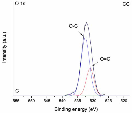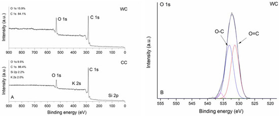The XPS survey spectra of studied biochars are shown in Figure 5A. As expected, characteristic strong carbon signals at 284.0 eV (C 1s) were observed for both CC and WC biochars together with varying amounts of oxygen detected at binding energy 531.5 or 532.5 eV (O 1s). The corn-cob biochar was notable for the relatively high presence of K (2.0 at%) and Si (2.2 at%). High-resolution XPS O 1s spectra were further analyzed to examine the nature of oxygen species on the surface of biochar samples. The O 1s band of CC and WC biochars (Figure 5B,C) were deconvoluted into the subsequent peaks: (i) peaks at 531.0 eV (CC) and 531.3 eV (WC) representing carbonyl oxygen; and (ii) peaks at 532.5 (CC) and 533.0 eV (WC) representing carbonyl oxygen in carboxylic and anhydrides, and O atoms in hydroxyl groups, which confirms the results found by FTIR. Moreover, it is evident that the intensity of the O-C component relative to the O=C component for CC is greater than for the WC biochar. Peaks at high binding energies 535.8 and 536.9 eV could be attributed to adsorbed water [45].