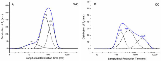 Relaxograms (i.e., distribution of longitudinal relaxation times) for the WC (A) and CC (B) biochar samples.