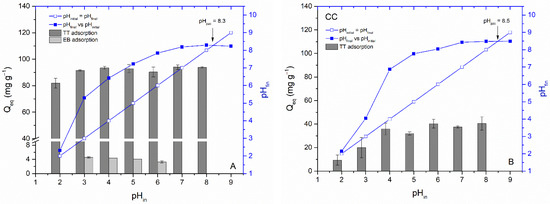 Determination of pHpzc and the influence of pHin on TT (100 mg L−1) adsorption by WC (A) and CC (B) and EB (45 mg L−1) adsorption by WC (A) biochar (8.3 g L−1; T = 22 °C).