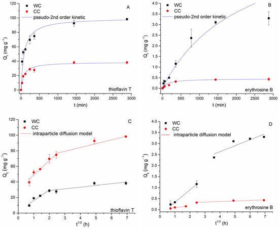 The kinetics of TT sorption by both wood-chip and corn-cob biochars is typically a multiphase process. In the first phase (within the first 60 min), we observed rapid sorption due to a higher driving force, in which more than 50% of the total amount of adsorbed thioflavin T is captured (52.5 mg g−1 for WC; 19.0 mg g−1 for CC). The second phase proceeded more slowly until the sorption equilibrium was established after 24 h (CC) and 48 h (TT), respectively, and TT adsorption capacity reached 98.3 mg g−1 (WC) and 38.2 mg g−1 (CC), respectively. A different trend was found in EB adsorption. During the first phase (60 min), the adsorption capacity of both WC and CC reached only 10% of the total amount of adsorbed erythrosine B. The second phase is represented by a gradual increase in adsorption capacity (3.3 mg g−1 for WC; 0.43 mg g−1 for CC), and the equilibrium state was reached at 24 h. A similar kinetic profile for EB adsorption by pumpkin-seed hulls was observed by Apostol et al. [54] with equilibrium achieved after 3 h.