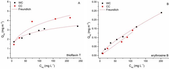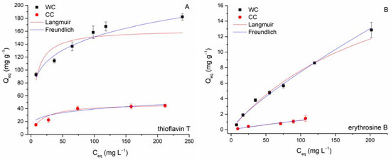Adsorption equilibrium. Isothermal tests were performed in batch mode (C0 TT 25–400 mg L−1; C0 EB 13–309 mg L−1, biochar dosage = 8.3 g L−1; pH 6.0; T = 22 °C) to determine the removal capacities of erythrosine B and thioflavin T using the WC and CC biochar. Freundlich (6) [61] and Langmuir (7) [62] isotherm models were employed to give quantitative information on the adsorption of EB and TT. The nonlinear forms are presented as follows: