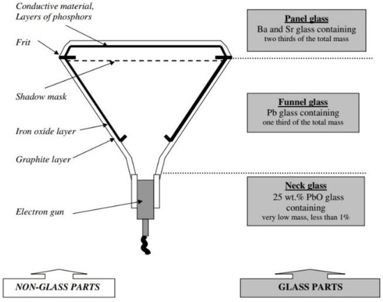 Computer and TV screens with cathode ray tubes (CRTs) have not been sold in Europe since 2011, when, through technological advancements, they were replaced by new TFT (thin film transistor) and LCD (liquid crystal displays) screens. Considering the “service life”, i.e., the duration of the cathode ray tube screens, and the fact that they can still be found in households, it is clear that a considerable quantity of these devices is stored in landfills. Precise data on the amounts of generated waste CRT glass are not readily available. According to the data shared by the WEEE Forum, the amount of CRT displays generated in the Europe (30 countries) has been declining since 2009, and it is estimated that in 2020, this amount was around 250 kt [1]. In the USA, there are around 232 million CRT devices which are still being used, so considerable amounts of those devices end up in landfills each year—it is believed that around 85% of these devices will be collected in the next ten years. According to the data in Ref. [2], in the USA in 2018 alone, 500 kt of CRT waste was generated. In addition, Shaw Environmental Inc. (Hamilton Township, NJ, USA) estimated that around 3.2 million units of CRT technology would require proper waste management every year as it will reach its end of life in 2022 [2]. TV screens constitute the largest part of electronic waste in China, with around a 50% share. According to the research of Quinghua University, the total amount of collected waste CRT glass exceeds 5.2 million tons, with 3.5 million tons of tinted panel glass, 1.7 million tons of funnel glass and 0.7 million tons of black-and-white glass. However, due to the high cost of CRT glass recycling and low value of the obtained raw material, only a fraction of waste glass is recycled in China in a formal way, observing all the regulations protecting human health and the living environment [3]. According to Singh et al. [4], the estimated waste generation of CRT TVs in China in the period 2010–2020 is around 3240 kt. In Serbia, in 2016, around 3080 tons of CRT glass were collected. The current practice in Serbia is that the collected CRT glass is exported to other countries and the countries taking in the recycled CRT glass are paid for that [5]. The three basic glass elements of a CRT screen are neck glass, funnel glass and panel glass (Figure 1). Neck glass contains around 25% lead, which is far more than other parts. Funnel glass is the largest part of the cathode ray tube, and it contains around 20% lead. The panel is the visible front part of the cathode ray tube which contains almost no lead (0–3%). It is coated with barium and strontium layers whose role is to protect viewers from the adverse effects of UV and X-ray radiation. The funnel and panel are mutually joined by the frit.