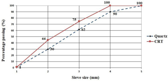 Particle size distribution of quartz aggregate and panel CRT glass.