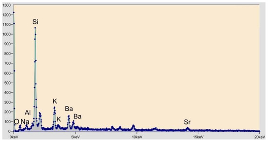 EDS spectroscopy of the ground CRT glass (Figure 4) determined a considerable presence of silicon. Oxygen, sodium, aluminum and potassium were also present. Because that the panel glass was coated with protective layers during the service life of the electronic device, the EDS spectroscopy detected the presence of barium and strontium in traces, which originate from these protective layers. The basic concrete layer was made with river aggregate fraction 0/4 mm (Figure 5a) and crushed limestone aggregate fraction 4/8 mm (Figure 5b). For the finishing layer, the visible layer was quartz sand with a particle size 0.25–1.2 mm. Physical properties of used aggregates are provided in Table 3.