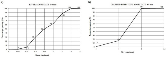 Particle size distribution of river aggregate 0/4 mm (a) and crushed limestone aggregate 4/8 mm (b).