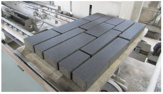 The production process of concrete blocks and flags is fully automated and computerized. Depending on the dimensions, the product is categorized as a block or flag (EN 1338 [25], EN 1339 [26]). In the experiment, the base layer of concrete was compacted by simultaneous vibration and pressing. In the second step, the components of the final visible layer of concrete blocks and flags were dosed, and the process of vibration and pressing was repeated once again. Blocks measuring 210 × 115 × 80 mm (16 specimens) and 300 × 165 × 80 mm (32 specimens) were produced, as well as flags measuring 390 × 165 × 80 mm (32 specimens), 420 × 115 × 80 mm (16 specimens), 480 × 165 × 80 mm (32 specimens), 540 × 115 × 80 mm (48 specimens) and 630 × 115 × 80 mm (32 specimens), for a total of 208 specimens. The same number of specimens was made without glass (reference specimens). The final visible layer of samples was on average 8 mm thick over the entire surface of the samples. The upper visible side of the samples was flat without curvature (Figure 6).