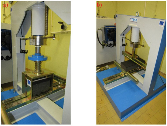 Splitting tensile strength tests were conducted on concrete blocks having 210 × 115 × 80 mm dimensions according to the EN 1338 standard, annex F. The upper and lower surfaces of the block were ground to smoothness. The tests were conducted on a digital hydraulic press UTEST UTC—5600 (Figure 7a). There were regular stress increments of 0.05 MPa up to failure of the specimen, and the load was applied by the packing pieces.