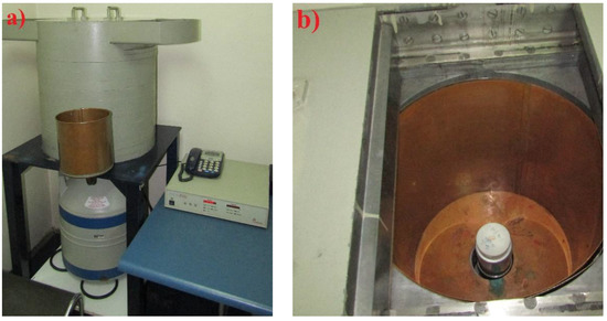 The radioactivity tests were performed on the pure CRT glass (3 samples), reference concrete (3 samples) and 3 samples of WG concrete. Samples of reference concrete and concrete with recycled glass (WG) were ground to pass the sieve with a mesh size of 1 mm without residue, and they were used as such in the tests. Gamma spectrometric analysis was performed using the HPGe gamma spectrometer Canberra DSA—2000 (Figure 8). An HPGe (high-purity germanium) detector was used with 25% efficiency and 1.85 keV FWHM (full width at half maximum) at 1332 keV (Co-60). Ra-226 activity concentrations were detected and measured on progenies of Pb-214 and Bi-214 at energies of 609 KeV, 295 keV and 351 keV. K-40 activity concentrations were measured at energy of 1460 keV. Th-232 activity concentration was measured at photopeak energy of 911 keV of Ac-228 as a first progeny of Th-232 after its alpha decay. The laboratory of Institute of Occupational Health in Niš, Serbia, where measurements were performed, is accredited in accordance with the ISO 17025 standard. The samples were placed in a 100 mL utensil. It is very important to accurately measure the mass of the sample before testing so that after the measurement, it is possible to calculate the presence of radionuclides in Bq per 1 kg. Becquerel is defined as the activity of the amount of radioactive material, with one Becquerel corresponding to one decay per second: 1 Bq = 1 s−1. Moreover, since different half-lives are required for different atomic nuclei, it is desirable to perform the test for several hours in order to detect all half-lives. The spectrometer used contains a hyper-pure germanium semiconductor detector and is fully digitized so that the measured values of gamma radiation are generated and displayed using the “Genie 2000” computer software. The complete test procedure is prescribed by the International Atomic Energy Agency in IAEA TRS 295: 1989.
