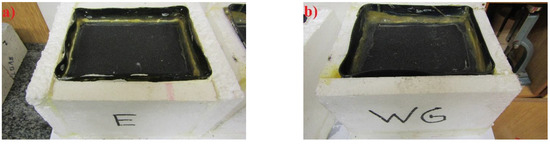 The testing principle of freeze/thaw resistance and de-icing salts is based on the procedure in which the prepared samples are submitted to 28 freeze/thaw cycles while the surface is covered with a 3% NaCl solution. The scaled off material was collected and weighed, and the result is expressed in kilograms per square meter. The number of tested samples was 6 of E concrete and 6 of WG concrete. The tested surface area of each sample was 22,500 mm2. The testing was performed in the Climatic Cabinet Controls 10-D1428/A with the time temperature cycle prescribed by the standard EN 1338, annex D. The mean values of the test results are provided in Table 5.