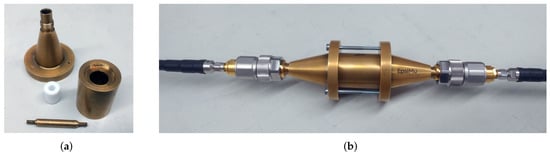 For measurements from 10 MHz to 8 GHz, we used a coaxial transmission line “EpsiMu” from Multiwave [21], as shown in Figure 2. This device consists of a sample holder which forms the outer conductor of the coaxial transmission line, an inner conductor, and adaptors to connect the 2.92-mm connectors from the network analyser. MUT (material under test) samples were prepared in the form of an annular ring which has an outer diameter of 13 mm and an inner (hole) diameter of 5.6 mm. The samples were 3D-printed slightly oversized and then machined to fit precisely into the sample holder. With the samples in place, the adaptors were assembled and the S-parameters measured with a Rohde & Schwarz ZVA40 vector network analyser. If the sample holder is air-filled, the geometry of this transmission line results in a 50- impedance. Due to the dimensions of this coaxial transmission line, higher-order modes can propagate above 10 GHz, which would affect the measurement; therefore, we use the coaxial transmission line only up to 8 GHz. Prior to the measurements, the network analyser was calibrated with an automatic calibration unit and the port extension feature was used to compensate for the additional connectors and adaptors used.