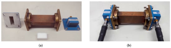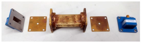 For the frequency range from 7 GHz to 13 GHz, we used a piece of WR-90 (X-band) waveguide and a set of coaxial-to-waveguide adaptors, as shown in Figure 3. The MUT samples were prepared in the form of small bricks having dimensions slightly larger than the waveguide. After 3D-printing the samples, they were machined to fit precisely into the waveguide. With the samples in place, the coaxial to waveguide adaptors were assembled and the S-parameters were measured. Prior to the S-parameter measurement, the network analyser was calibrated using the TRM (thru-reflect-match) method: for the “thru” standard, we connected the coxial to waveguide adaptors back-to-back; for the “reflect” standard, we used a shorting plate directly in front of the coaxial to waveguide adaptors, and for the “match” standard, a waveguide load was used.