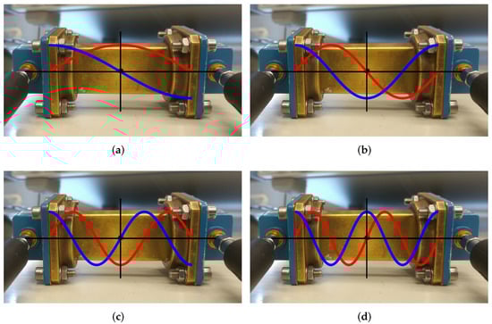 Waveguide rectangular resonator with schematic representation of the electric (red lines) and magnetic (blue lines) field distributions for different modes. (a) TE mode, ; (b) TE mode, ; (c) TE mode, ; (d) TE mode, .