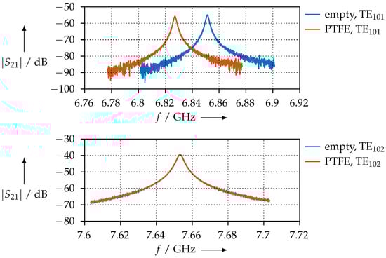 Therefore, for the “odd” modes, only the permittivity can be determined (because the magnetic field is null where the sample is placed), whereas for “even” modes, only the permeability can be determined (because the electric field is null where the sample is placed). Note that the sample is always placed such that it is parallel to the field, i.e., for the permittivity measurement, the sample is perpendicular to the broad wall, and for the permeability measurement, the sample is perpendicular to the narrow wall. As an example, Figure 6 shows the measured frequency responses for this resonator when it is empty or when a PTFE sample is inserted. The TE mode is affected due to the dielectric properties of PTFE, i.e., its resonant frequency and Q are slightly lower when the PTFE sample is inserted. On the other hand, the TE mode is unaffected since PTFE has no magnetic properties ().