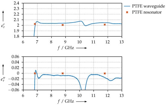 For reference, Figure 8 shows the permittivity that we extracted for the PTFE sample using the waveguide method and compares the values with the ones that have been obtained with the resonator. Except for the low end at 6.6 GHz, which is close to the waveguide’s cutoff frequency, we observe good agreement between the two methods.