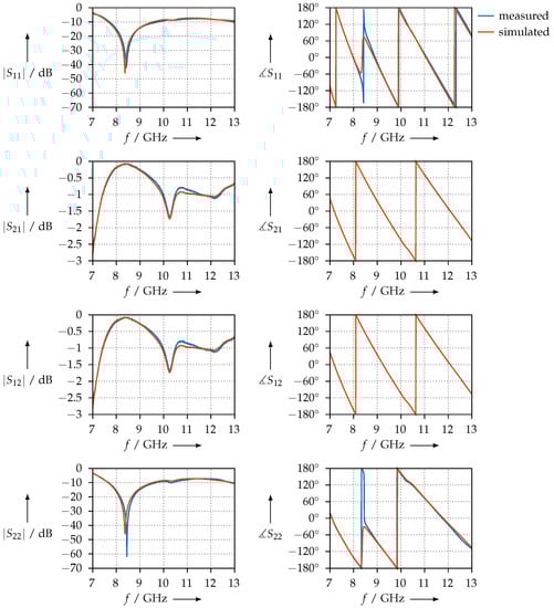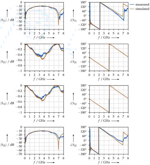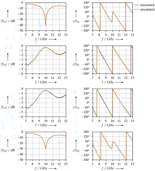 As we can observe from Figure 9, the two conditions are satisfied and the measurement is consistent. We also plotted the simulated S-parameters: using the permittivity shown in Figure 8, we calculated , , , and with the aid of Equations (12)–(14) and plotted the S-parameters calculated in this way together with the measured ones.