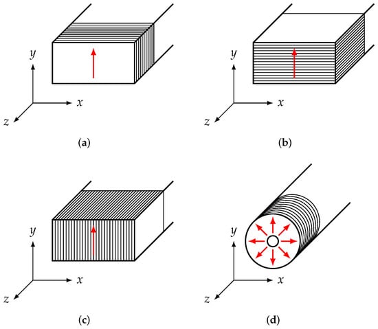 As we will show in our results, the process of 3D printing leads us to expect that the material parameters should be anisotropic to some degree, i.e., the material parameters will depend on the way in which the MUT sample was printed. To illustrate this, consider the geometries shown in Figure 12. The 3D printer will produce the MUT samples layer by layer. These layers can be oriented in different ways that are shown in Figure 12. The waveguide’s broad wall is aligned with the x-axis, whereas the short wall is aligned with the y-axis. The electromagnetic waves travel in the -direction.